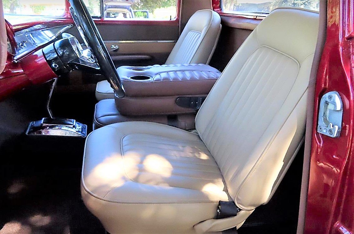The Chevy is powered by a 317ci V8 paired with an automatic transmission. Upgrades include a custom interior with leather seats and console, as well as a B&M shift kit and added gauges.