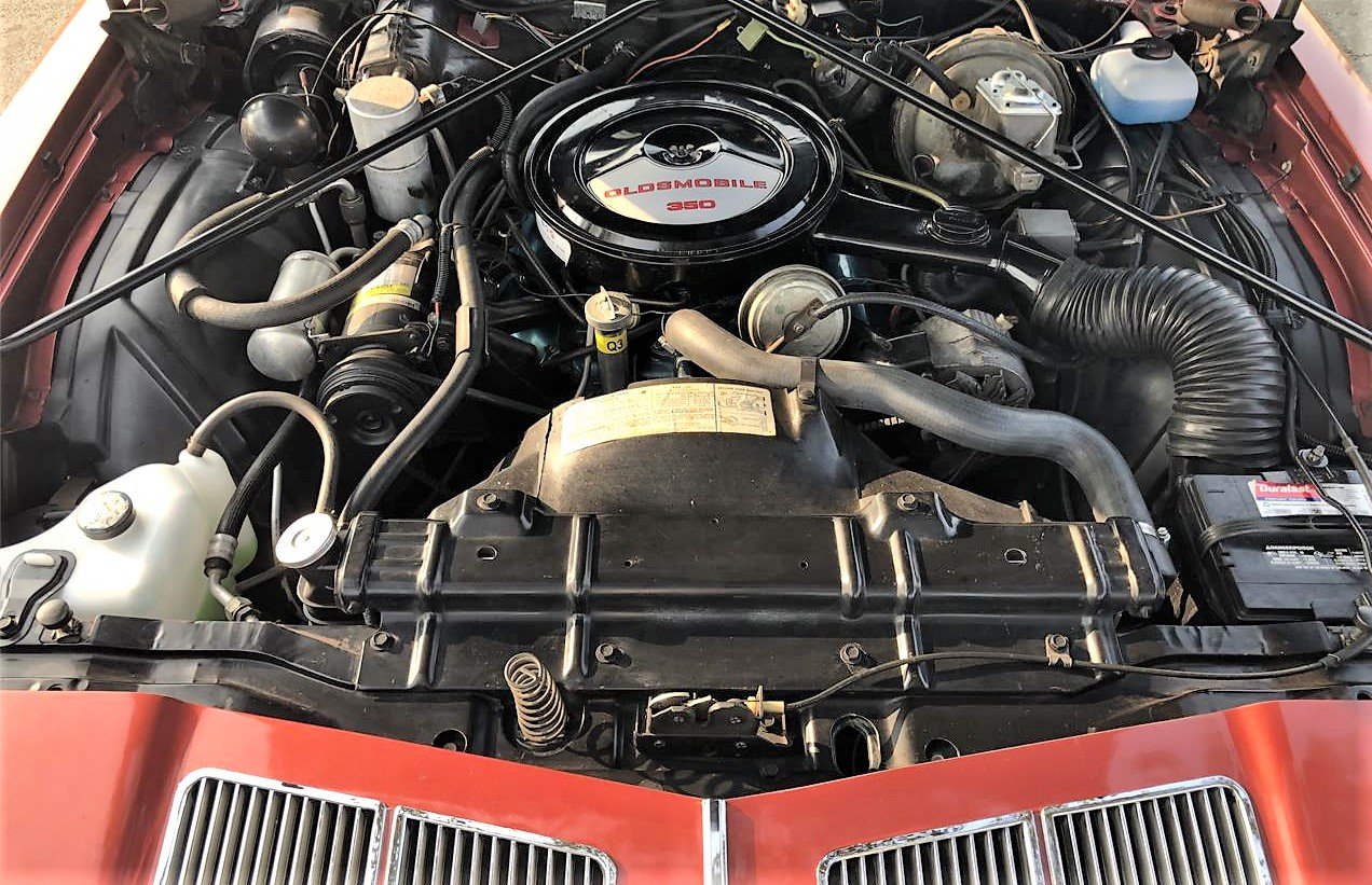 The Oldsmobile has had a bunch of recent maintenance work done, the seller says, including new whitewall tires, shocks, replaced oil-pan gasket, oil pump, oil change, value-cover gaskets, crank seal, timing chain and gear, new water pump, transmission pan, front and rear seals, speedo and gear selector seal, transmission service and filter, differential service and gasket, all drive belts and full service to the A/C, which has been converted to 134A.
