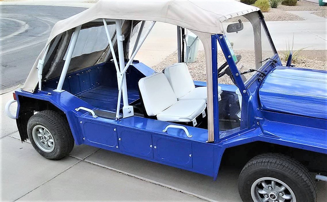 This apparently well-loved Moke has been comprehensively restored, according to the seller, and comes with two tops, side curtains and “roo bars” protecting the front and back ends. It rides on 10-inch Minilite wheels.