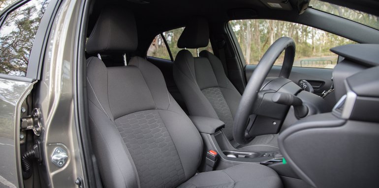 The Corolla’s cabin in simple, contemporary and stylised – particularly that split dash fascia and centre console arrangement – if not quite as out-and-out funky as its CH-R crossover stablemate.