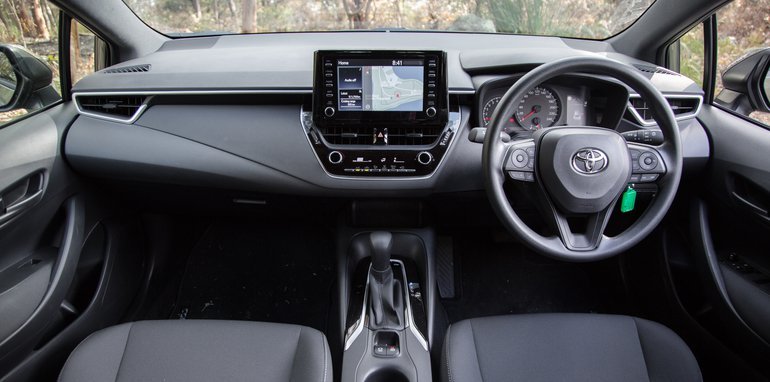 The Corolla’s key equipment highlights include autonomous emergency braking, auto high-beam LED headlights, a large 8.0-inch touchscreen, adaptive cruise control, speed sign recognition, active lane keeping and heated electric-folding mirrors: impressive standard fitment for a base non-primo small car.