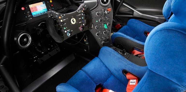 Inside, the cabin is pure 488 GT3. That means FIA-approved bucket seats, a button-festooned steering wheel, and a fully digital instrument binnacle all feature, along with some delightful blue trim. Looks pared-back and purposeful, huh?