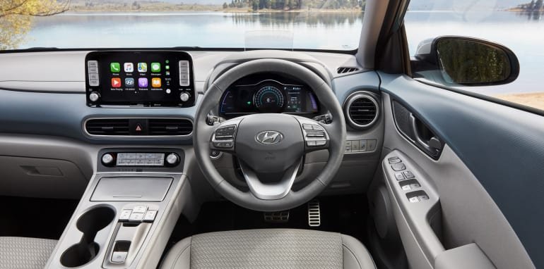 Compared to the regular Kona, the Electric version has a new digital instrument cluster and centre screen surround, a slicker climate control panel and a reworked area where the transmission tunnel would usually reside, incorporating buttons instead of a shifter, and more storage.