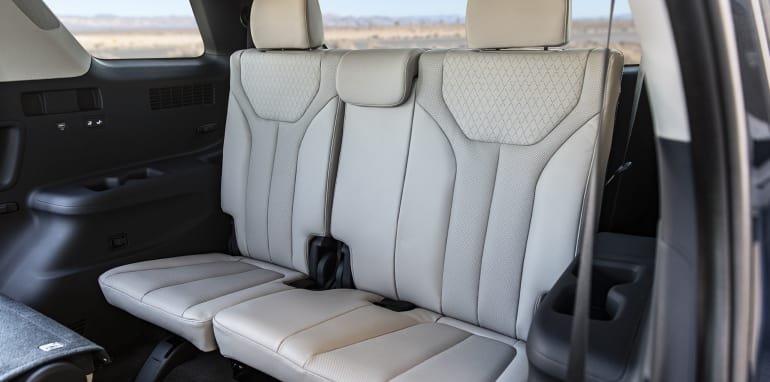 Hyundai says the Palisade offers up to seven USB outlets, second-row seat ventilation with the captain’s chair option ticked, and roof-mounted ventilation for all three rows.
