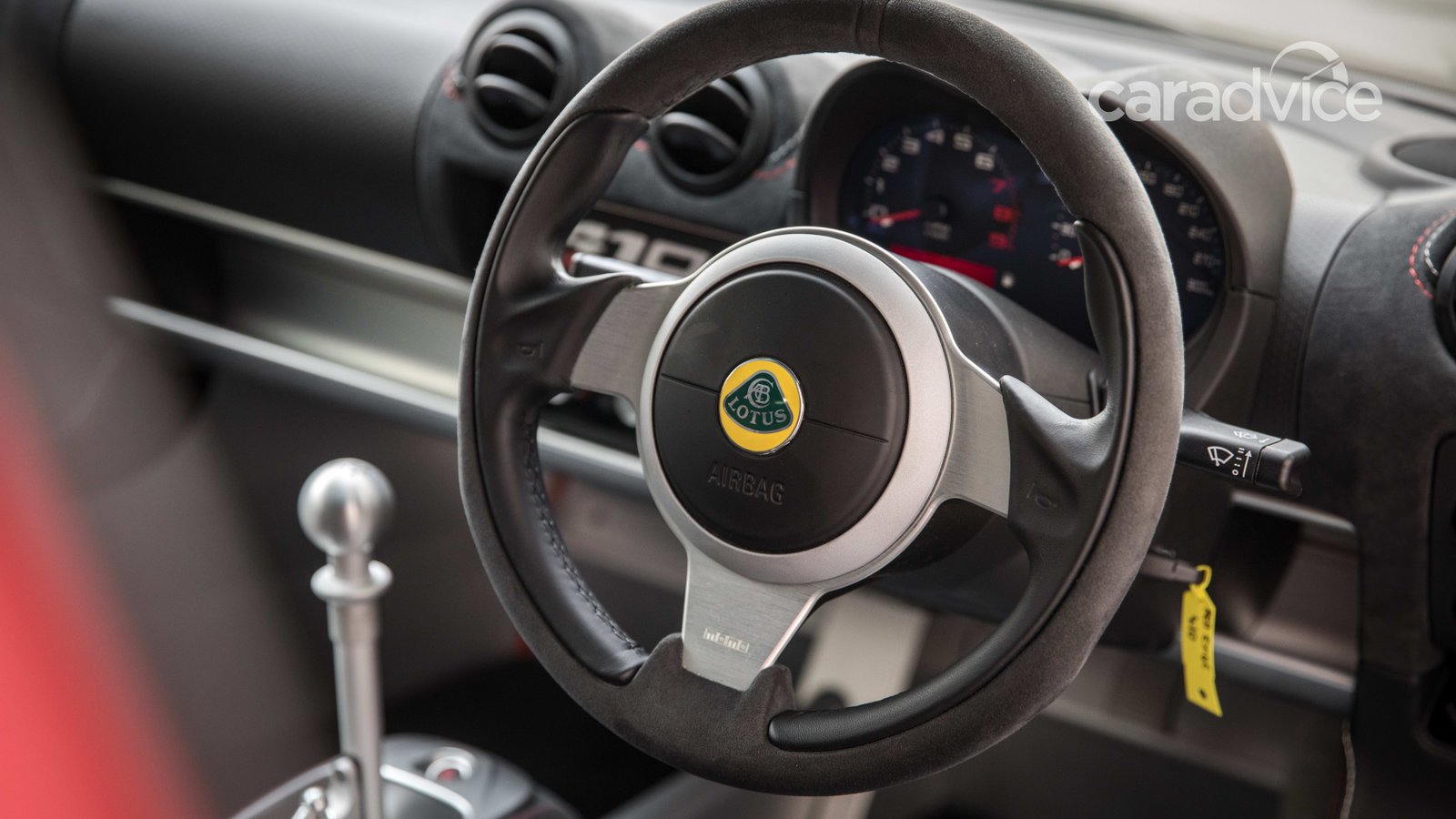 Yes, all Australian-delivered Exiges come with air-con as standard, and that’s pretty much where the list of creature comforts ends. There’s no power steering, no cruise control, no modern safety tech, no cupholders, no infotainment, not even a radio. You can option a two-speaker stereo for $1199, but really, why would you? The sound of that raucous V6 behind your ears is music enough. Rear-view camera? Yeah, right. Instead, there are four wheels, two seats, a steering wheel, seatbelts and a couple of airbags. Oh, and our test car was fitted with optional floormats ($229).