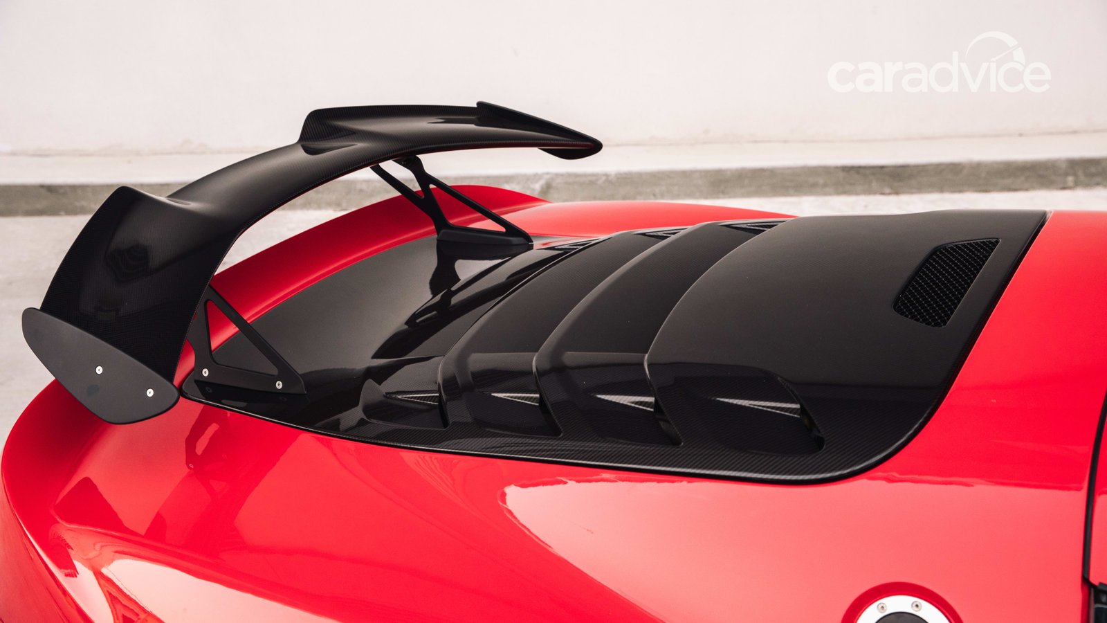 Take a peek in the rear-view mirror and you’ll notice two things. One, there’s not a lot of visibility out back, thanks in part to the large carbon-fibre slatted tailgate. And two, the exposed engine just behind your head fills the mirror.