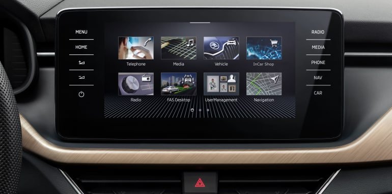 Skoda says the dashboard and door panels feature soft foam surfaces with a new type of grain.