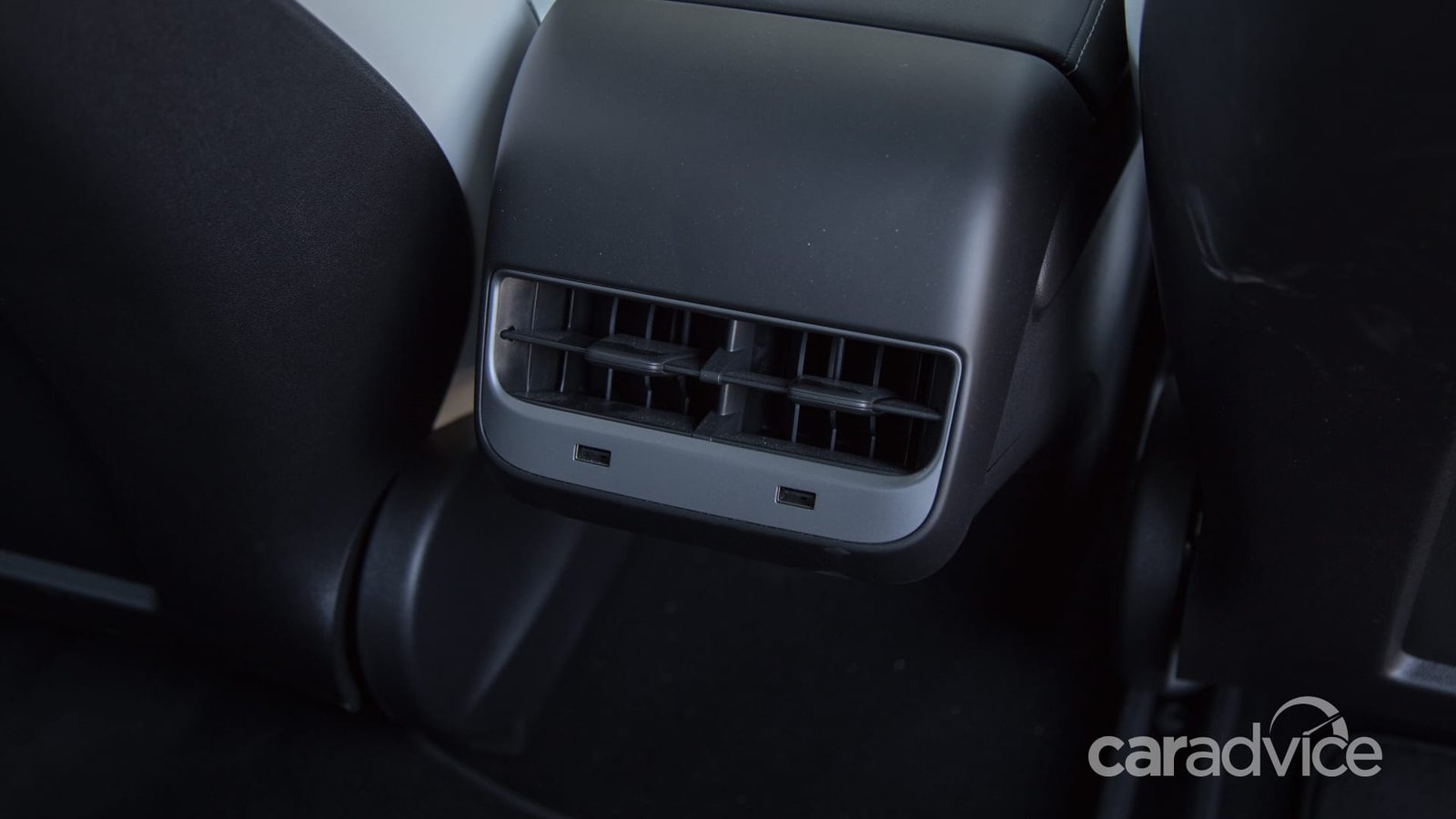 As you move to the second row you’ll find two air vents and more than enough legroom. But, there is a slight compromise. The sub-floor battery storage means the floor sits higher than it would in a ‘regular’ car. The end result is a lack of toe room beneath the seat in front. It can be a real problem if you have big feet or want to try and stretch out. Tall passengers will also find a slight lack of headroom with the sloping roof line eating into headspace. There’s a centre armrest that sits between the two outboard seats, plus two ISOFIX points.