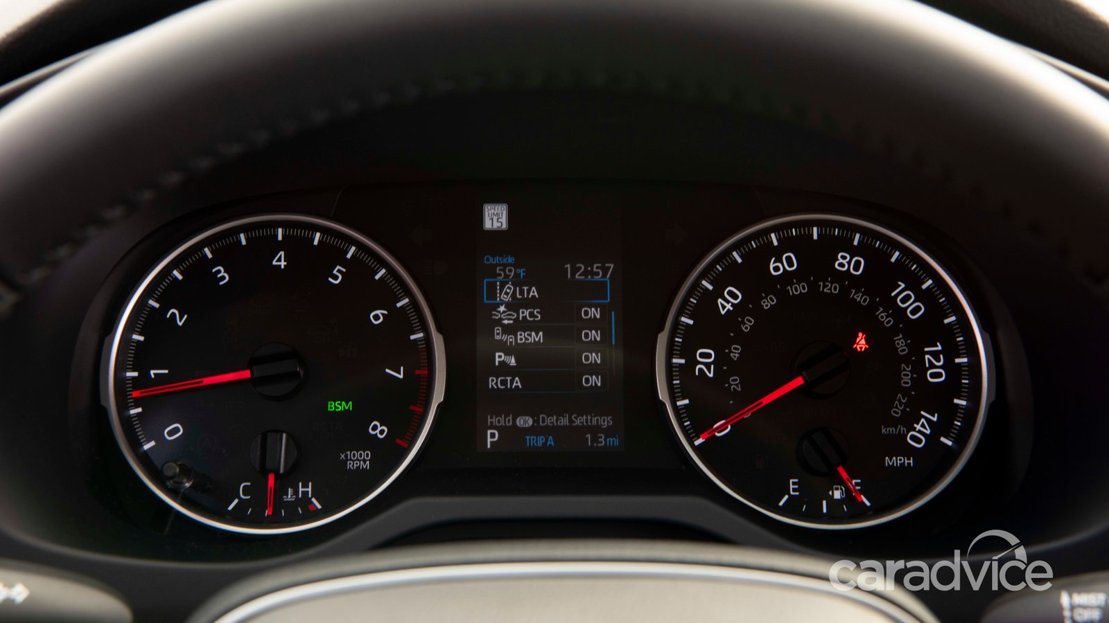 A novel addition to the RAV4’s tech credentials is the digital rear-view mirror, which switches from a conventional mirror to view-angle rear camera display at the touch of a button in its housing. It is a neat party trick, though in actual usability it’s tough to judge rearward parking distances and obscures anything below the rear window line. Not nearly as useful as a conventional rear-view camera then, and this car’s multi-view 360-camera system is far superior for guidance when manoeuvring.