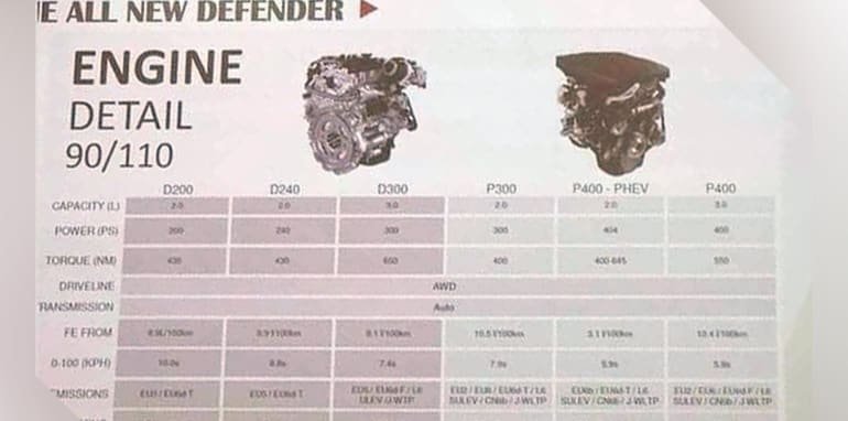 Details about the drivetrains, dimensions and features of the Land Rover Defender have been leaked ahead of its launch later this year.