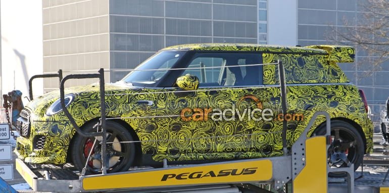 Photographers have snapped the Mini JCW GP on the back of a car carrier in Europe, giving us a closer look at what the German-owned British marque has in store for its new performance flagship.