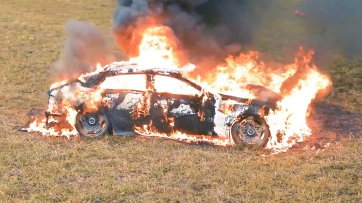 Disgruntled Russian YouTuber torches his Mercedes-AMG high-performance sedan. He claims his car was faulty, others say it’s a publicity stunt.