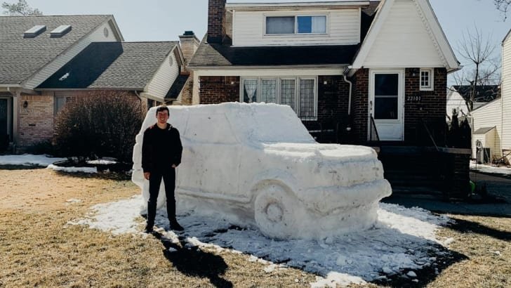 Apparently, DiMaria does this kind of thing every year, saying: “I enjoy doing the Ford-themed sculptures each year (when there’s enough snow available) because I work for Ford and so do a lot of other people in Dearborn.”