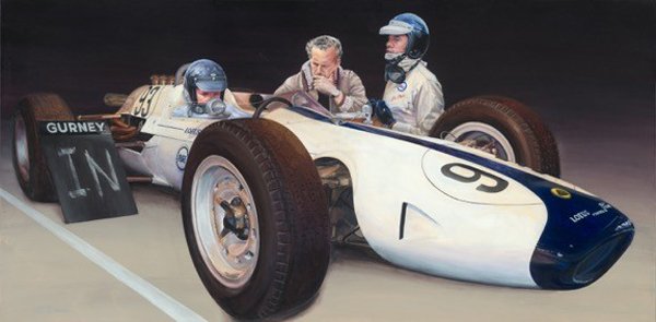 Dausch has created a beautiful rendering of Dan Gurney’s 1963 Lotus 29/1, depicting the legendary Californian Gurney sitting in the cockpit with car owner Colin Chapman and teammate Jim Clark at his side. Chapman is clearly deep in thought, listening to Clark’s analysis – all in the name of speed and the goal of winning.