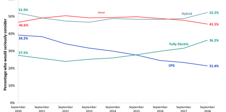 By contrast, only 45.4 per cent would now consider a diesel vehicle as an alternative to petrol, meaning hybrids are now seen as a better alternative than oil-burners to a majority of respondents.