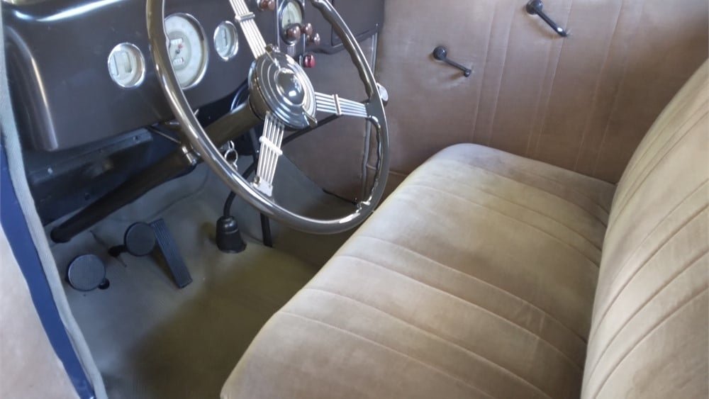 The clean body of this coupe was recoated in Washington Blue during restoration in 2020 and is accented by running boards, dual mirrors, chrome brightwork, and a rear-mounted spare tire with a body-colored hard enclosure. Even the steel wheels have been color-matched in blue to tie the overall theme together. The seller states that the car retains its original floor pans.