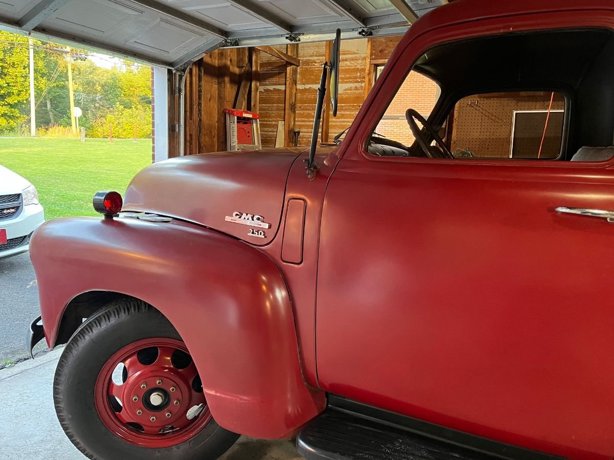 This GMC was factory-equipped with a solid front axle and a solid rear-drive axle. Braking is provided by manual four-wheel drums that were replaced in 2023.
