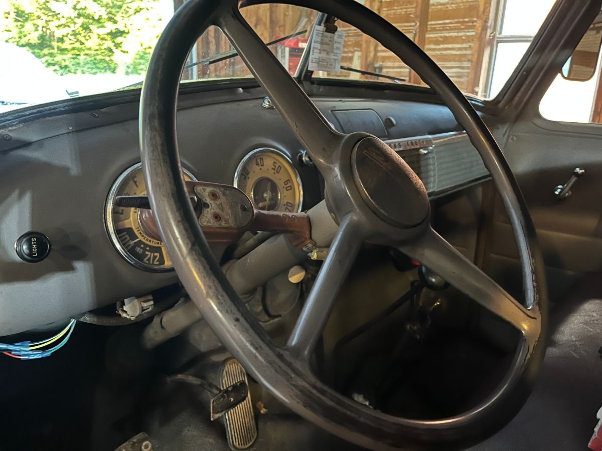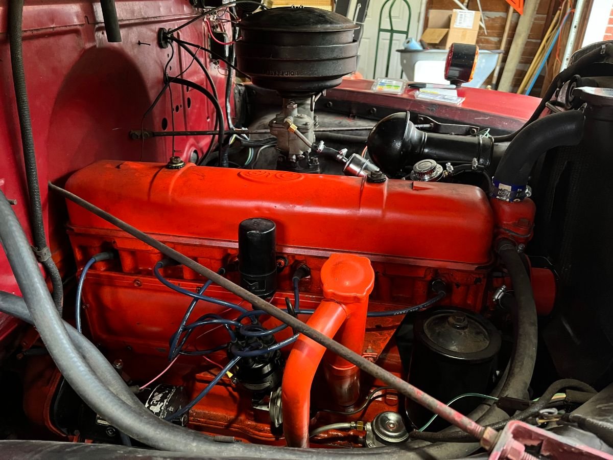 Power is provided by a rebuilt 228cid inline-six that was overhauled in 2018. It is backed by a four-speed manual transmission. The carburetor, fuel pump, starter, and six-volt battery were replaced in 2023.