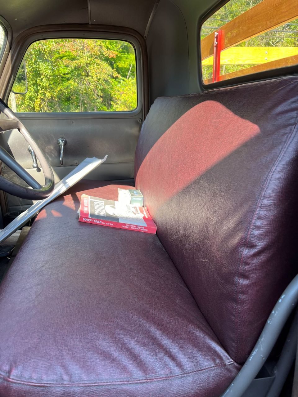 The cab is fitted with a maroon vinyl bench seat. Features include manual steering, accessory turn signal system, floor-mounted manual shifter, gray door panels, and gray painted trim.