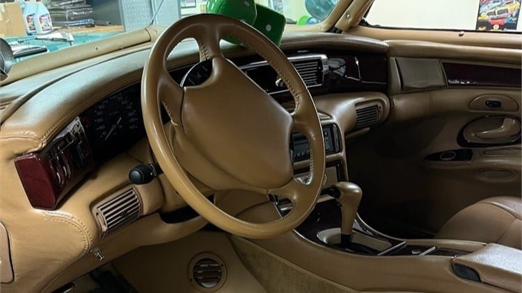 A Seafoam Pearl paint job does a great job of accentuating the swooping lines of this two-door. Exterior enhancements include a grille bar from a 1955 Plymouth, frenched headlights, dummy spotlights, a chopped top with removed B-pillars, shaved door handles, custom taillights, and much more. This car will undoubtedly leave people wondering, “What is that?”