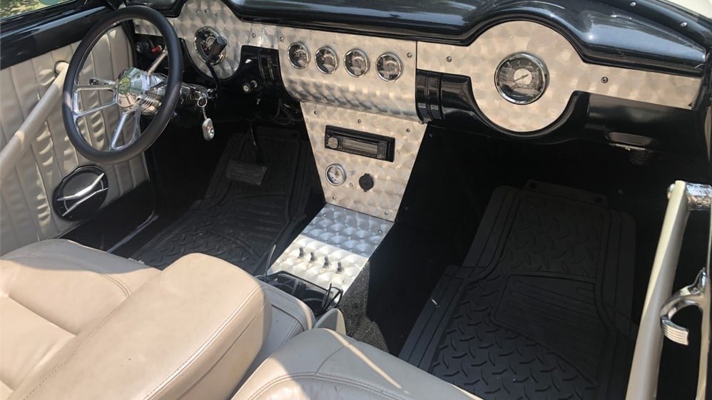 The interior on this custom hot rod received late-model power-adjustable bucket seats, power windows, power steering, and a CD sound system which all work together to bring it into the modern era. The dash face is adorned with engine-turned aluminum trim which extends to a custom center console.