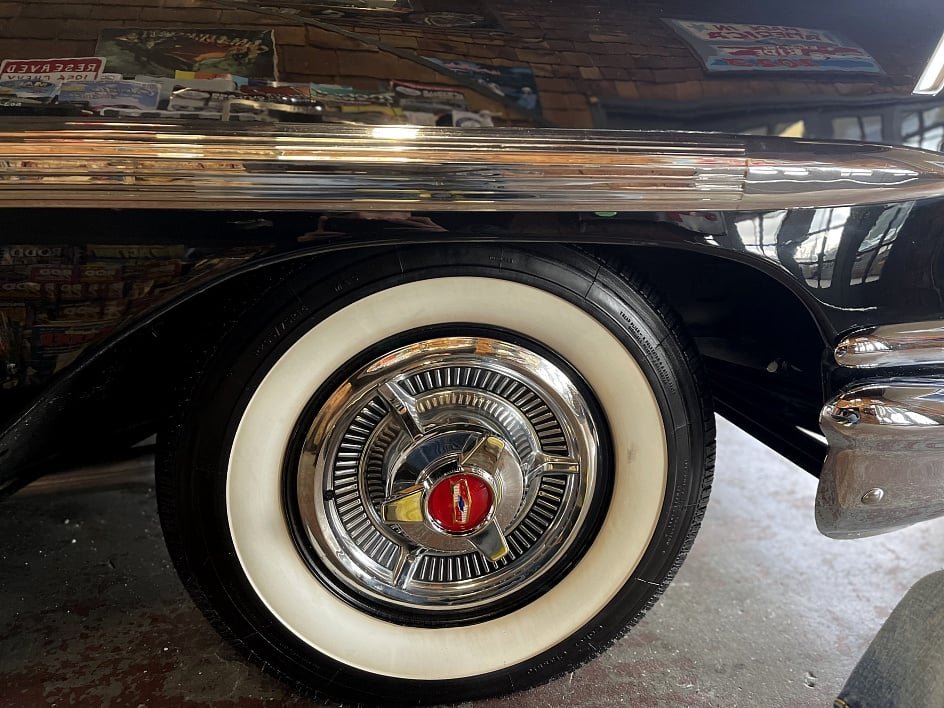 Steel 14-inch wheels with wheel covers and knock-off-style center caps are wrapped in whitewall tires.