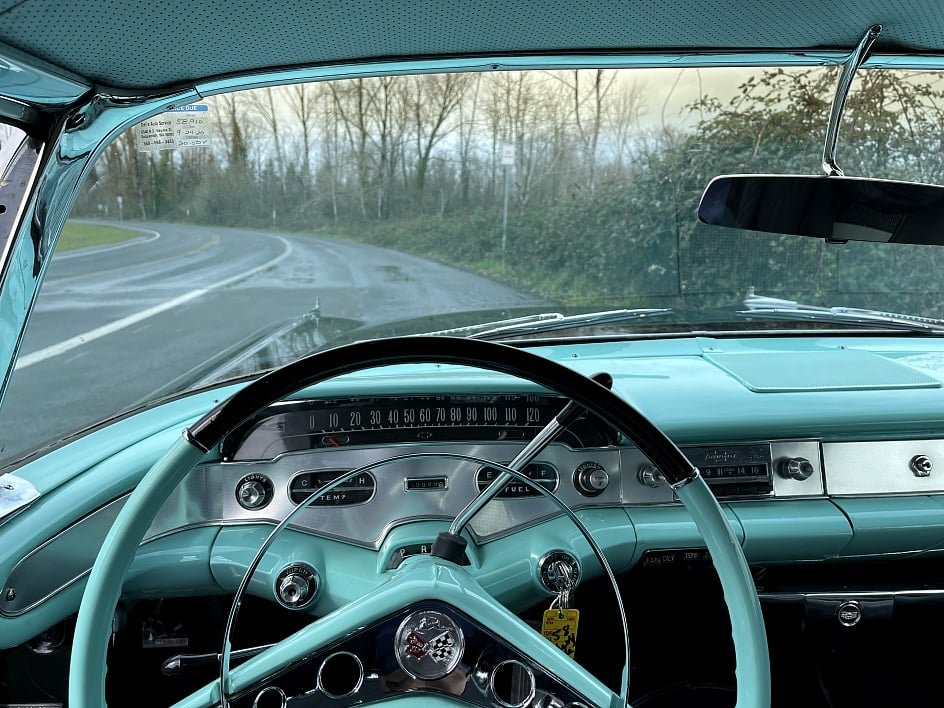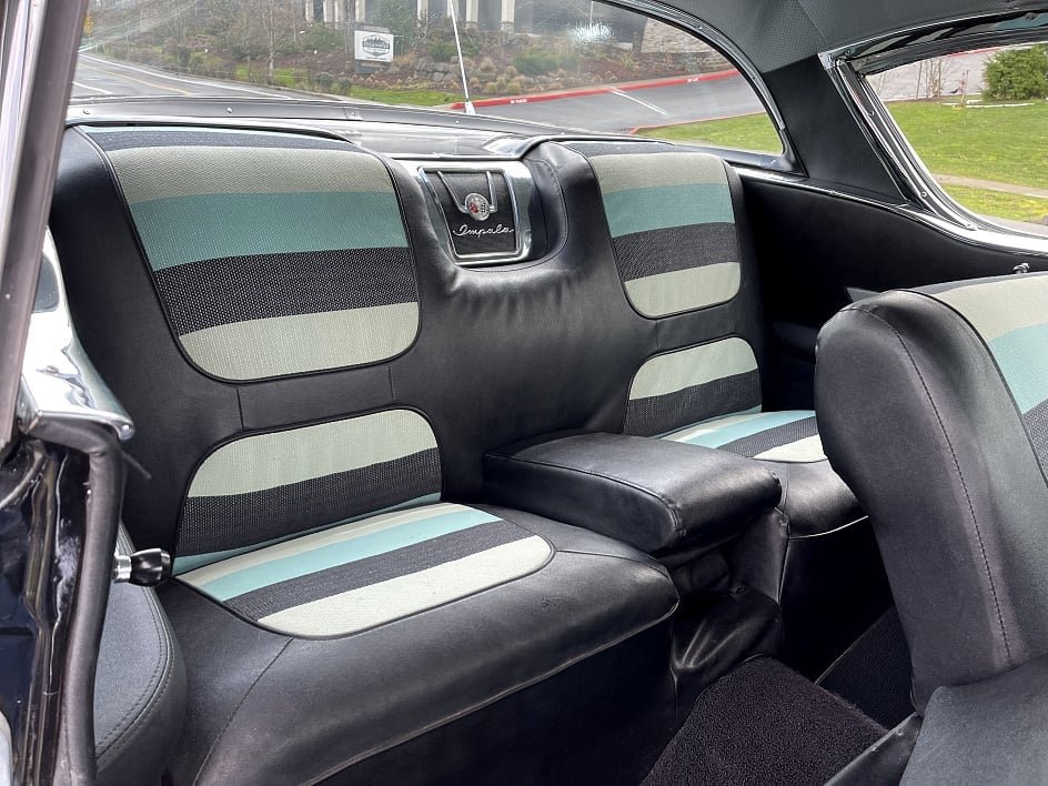 The cabin is furnished with black vinyl seats upholstered with turquoise/black/gray cloth inserts (code 806). The seats are complemented by matching door panels and turquoise dashboard. Other features include a push-button AM radio and clock.