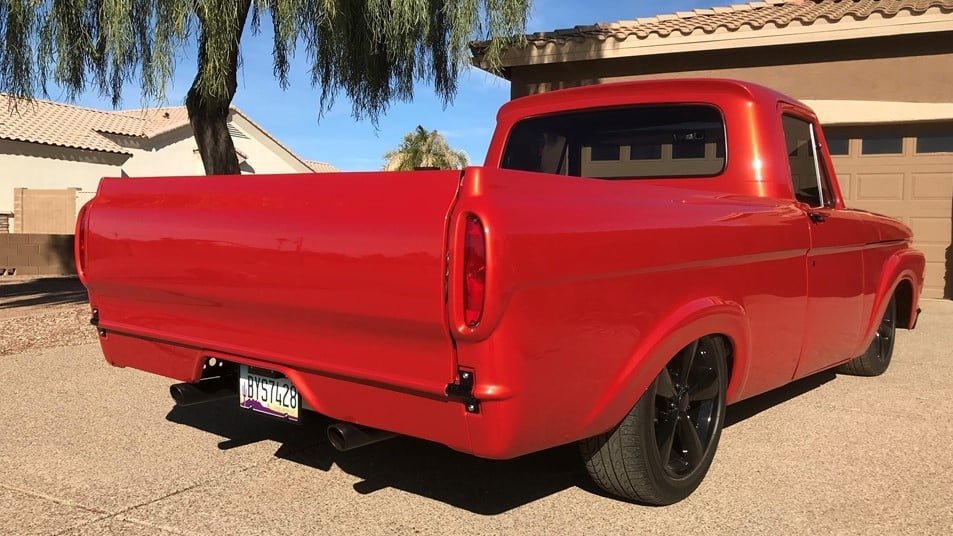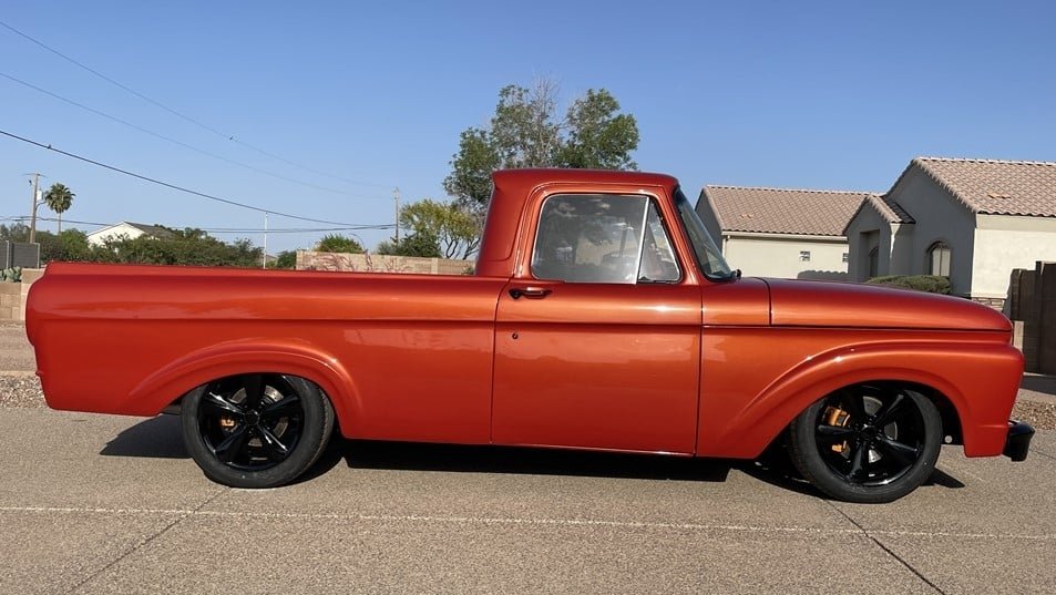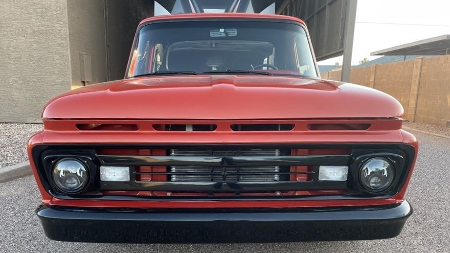 This 1962 Ford F100 has the heart of a 37,000-mile Crown Victoria and received a complete rotisserie restoration. Power comes from a 4.6-liter Modular V8 paired with a 4R70W four-speed automatic transmission, and upgrades include a Vintage Air A/C system, power-assisted four-wheel disc brakes, Ridetech coilovers, power windows and seats, and more. Painted Habanero Orange Metallic over a black vinyl interior, this F100 is being sold in Arizona with restoration documentation and a clear title.