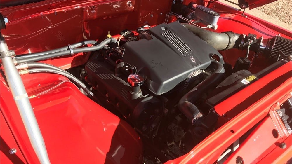 The 4.6-liter Modular V7 was sourced from a 37K-mile 2003 Ford Crown Victoria along with a 4R70W four-speed automatic transmission. The engine bay has been upgraded with a color-matched firewall, an engine cover, and an electric fan. Service included a recent oil change.