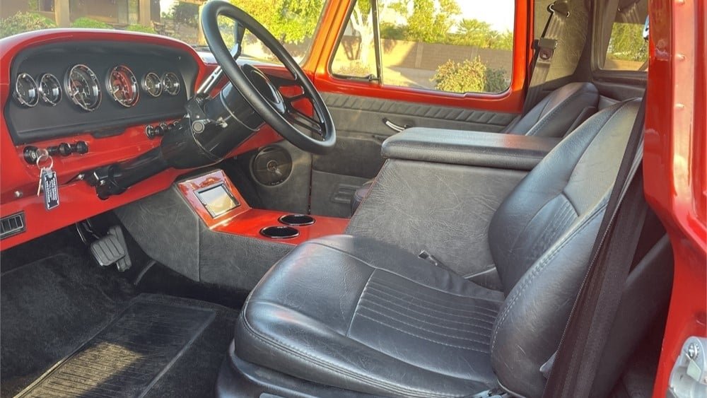 The Habanero Orange exterior of this F100 was applied during a frame-off restoration in 2021. Features include black bumpers and accents, a forward-tilting hood, smoothed bed seams, a smoothed tailgate, a rear rollpan, Frenched taillights, and a dual exhaust system.
