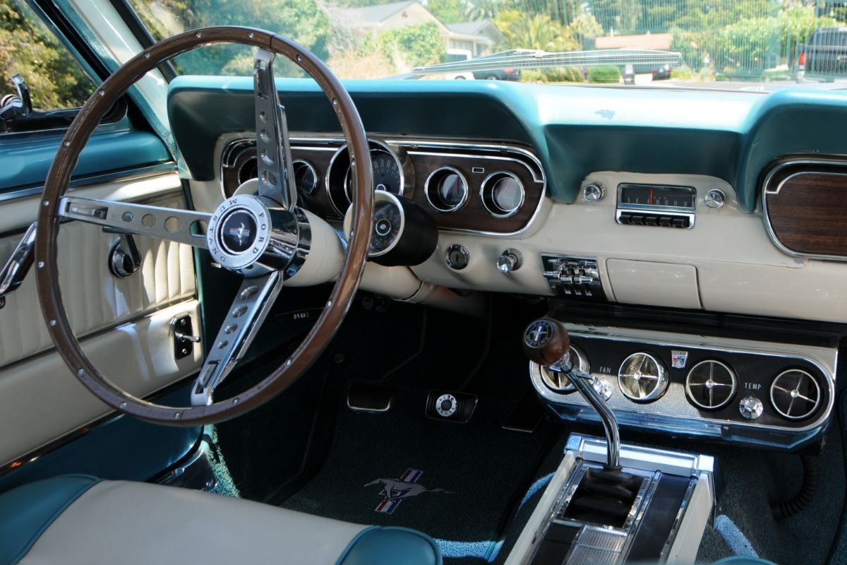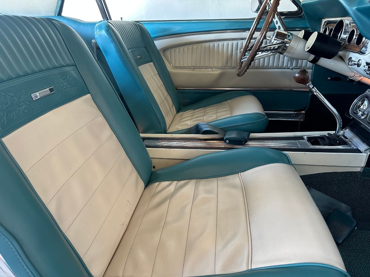 The interior is fitted with two-tone Light Aqua and White Décor (code 67A) vinyl interior with front bucket seats. Features include embossed “Pony” seat inserts, center console, wood-rimmed steering wheel, a push-button AM radio, and air conditioning. The latter runs modern refrigerant and is connected to new components and a new blower motor.