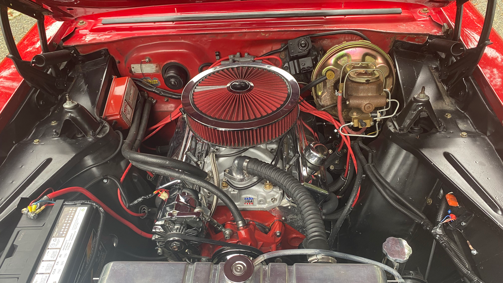 The 383cid stroker V8 under the hood has been upgraded with MSD ignition, an aluminum radiator, dish pistons, a performance camshaft, Edelbrock heads, and Flowtech headers. The seller estimates that this gives the engine over 320 horsepower. Recent maintenance includes an oil change and the replacement of the water pump gaskets.