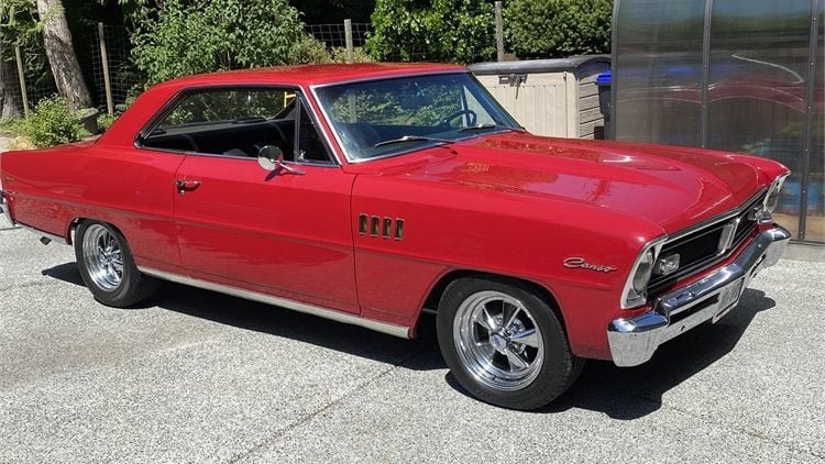 The seller describes this car as a 1967 Acadian Canso Sport Deluxe Canadian-built coupe that has been upgraded with a 383cid stroker V8 backed by a BorgWarner four-speed manual transmission. It features power steering and brakes, Edelbrock heads, Flowtech headers, a McLeod Racing clutch, MSD ignition, and an aluminum radiator. Finished in red over a black and white vinyl interior, this Canso is now offered with build documentation and British Columbia, Canada, registration in the seller’s name. The car is said to be rust free rides on Cragar five-spoke 15-inch chrome wheels.