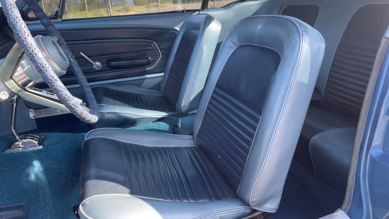 The two-tone blue vinyl interior includes front bucket seats and a rear seat upholstered in dark blue and light blue. While retaining the original charm, this Mustang boasts several convenient features, including power steering, front disc brakes, and an Alpine AM/FM/CD stereo that brings modern-day entertainment to your classic ride. This Mustang features include manual windows, a floor-mounted automatic transmission shifter, and a three-spoke steering wheel with an aftermarket grip.