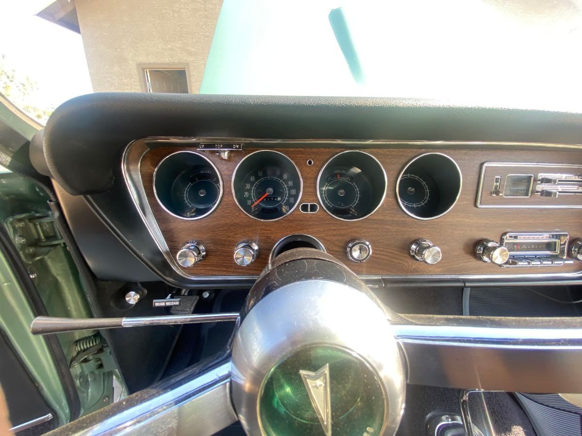 During its 2005 frame-off restoration, the GTO’s exterior was refinished in the original Linden Green (code H) hue. Features include a non-functional hood scoop, black pinstripes, rocker and wheel well moldings, and power-operated black convertible top.