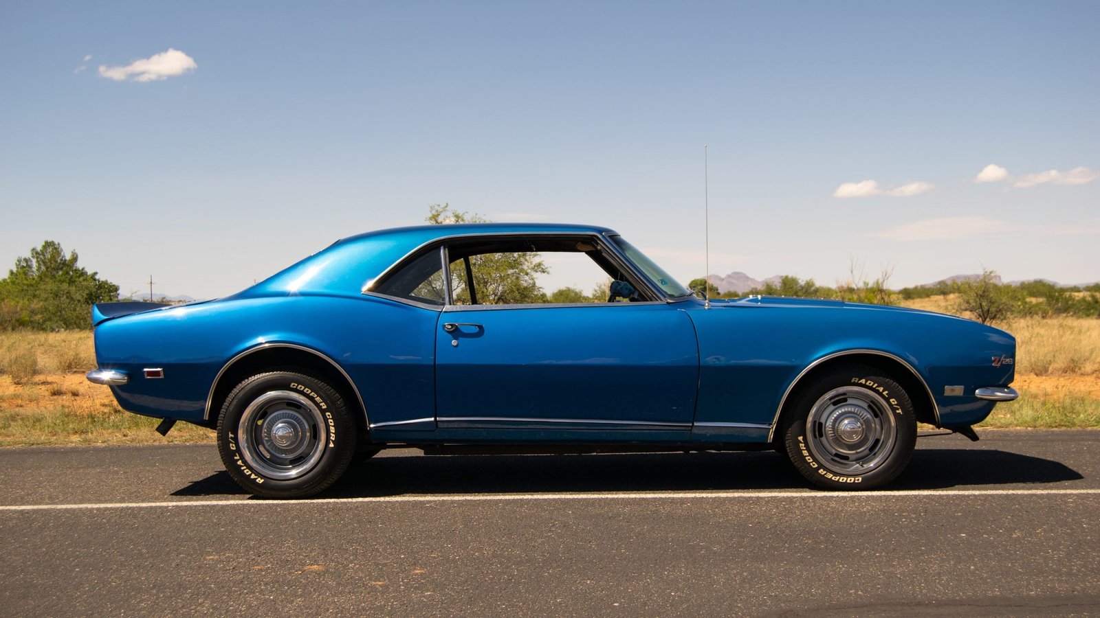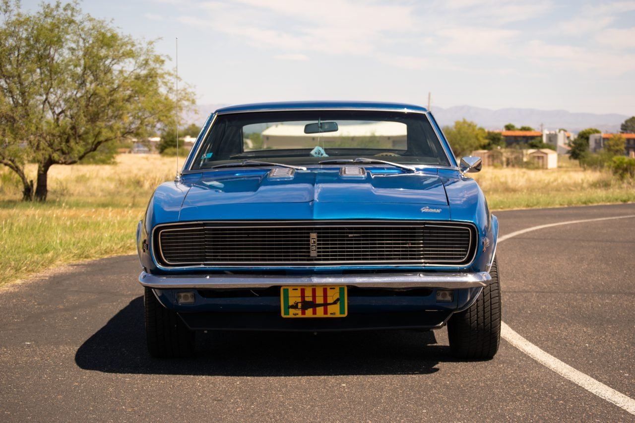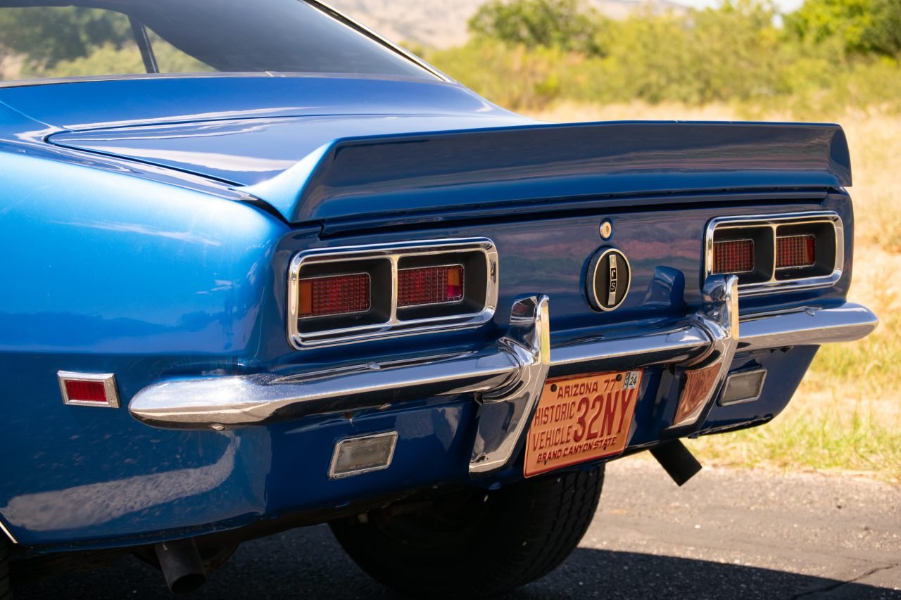 This is not a restored to original specification show car but one that is built to be driven. This specific Camaro was originally painted Sequoia Green (code V) and now has a high quality repaint in Electric Blue Metallic. Features include chrome bumpers, an RS grille with hideaway headlights, an SS hood, a fender-mounted antenna, chrome wheel opening and rocker moldings, a rear spoiler, and an RS fuel cap.