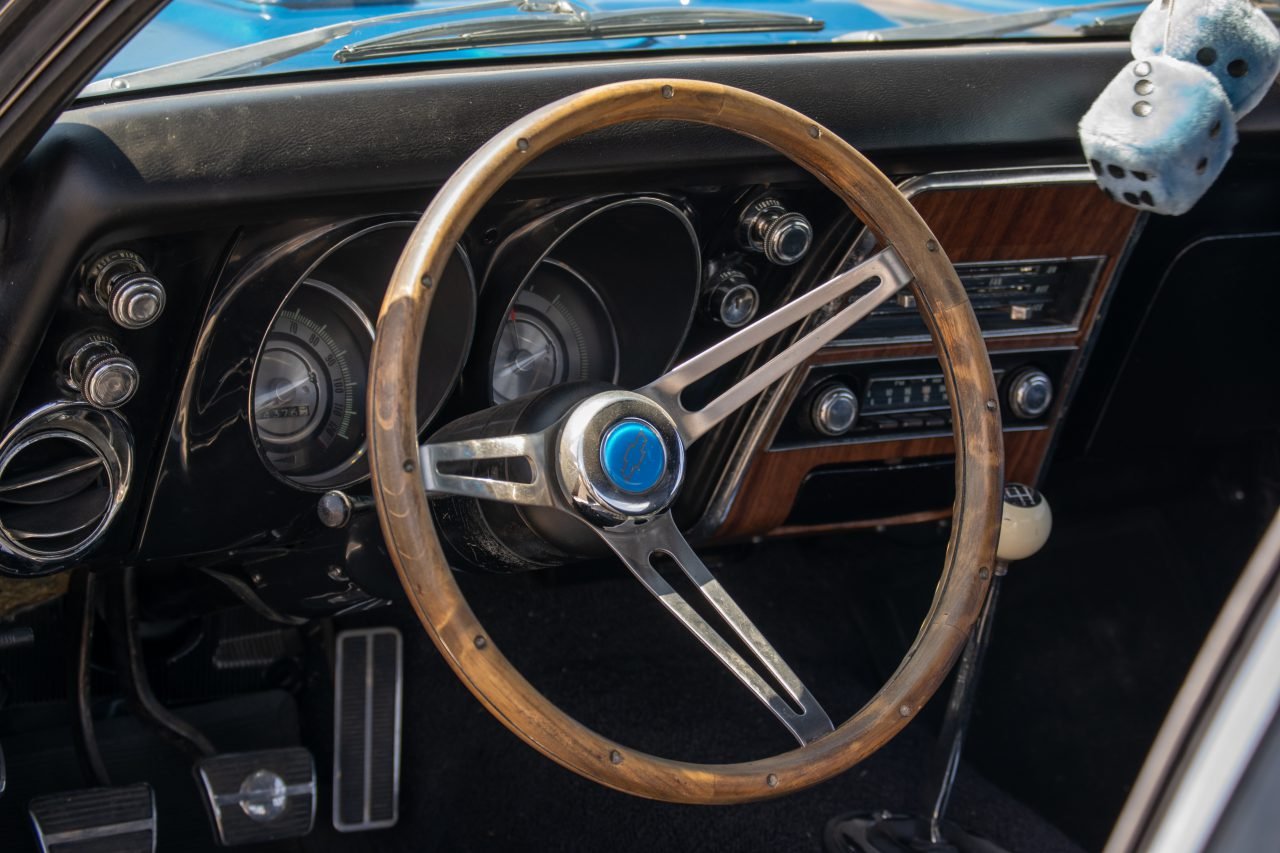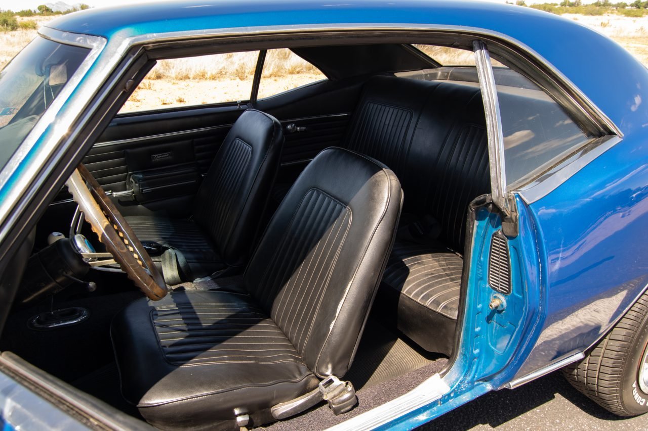 The interior of this Camaro features front bucket seats, rear seat, rear trim, and door panels that are said to be covered in the factory-installed black vinyl (code 712). Features include manual windows, a floor-mounted manual transmission shifter, a factory AM/FM radio, and a wood-rimmed steering wheel. The interior looks to be in good condition overall, but it looks like it might be time for the drivers seat to get a new seat cover due to some seam splitting that can been seen in the photos. That being said, the rest of the interior including the dash and headliner look to be quite nice.