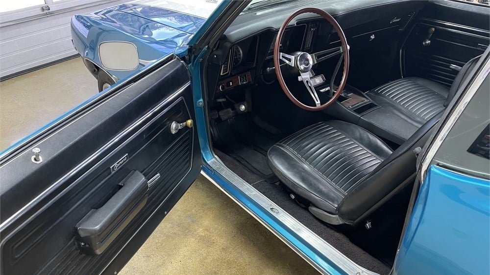 While reportedly not perfect, the metallic blue respray on this car is said to show well overall. It rides on a set of Rally 15-inch wheels with staggered tires, and it features dual accent striping on the hood and the decklid (this was a visual Z/28 identifier). The car is badged as having a 302cid powerplant, but the car’s original motor has been replaced with a 350cid unit. The odometer on the car shows fewer than 70,000 original miles, and the seller states that this is a true reading. However, with any five-digit mechanical odometer, this is difficult if not impossible to verify. The phrase “caveat emptor” applies here.