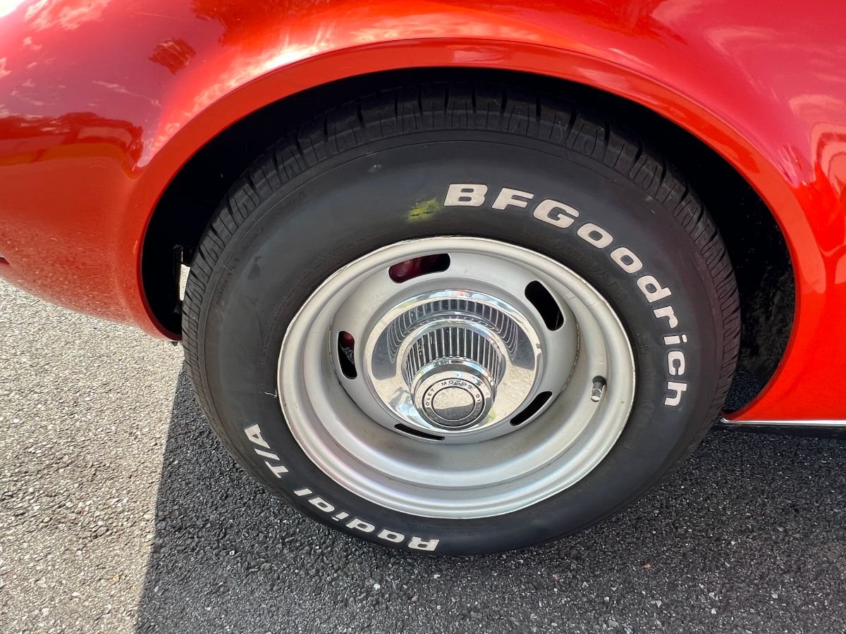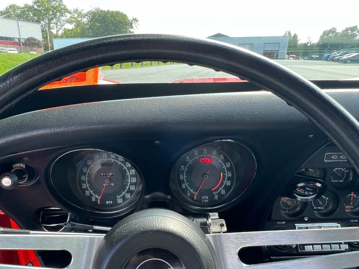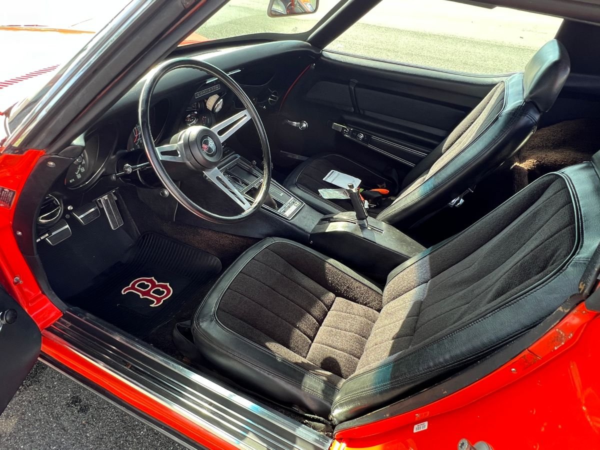 The Monaco Orange (code 990) paint was refinished during the 2015 frame-off restoration under the direction of John’s Corvette Service in Laconia, New Hampshire. Features include rocker moldings, driver-side mirror, rear-mounted antenna, and special domed big-block hood.