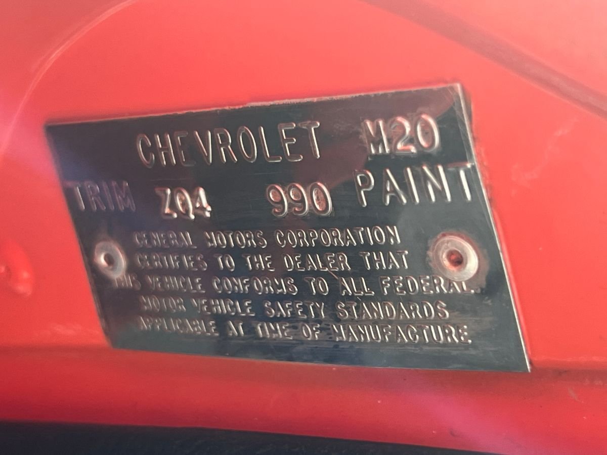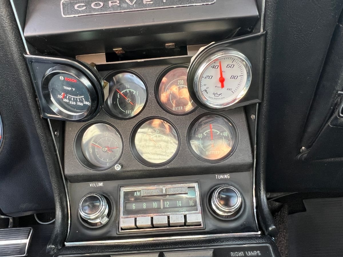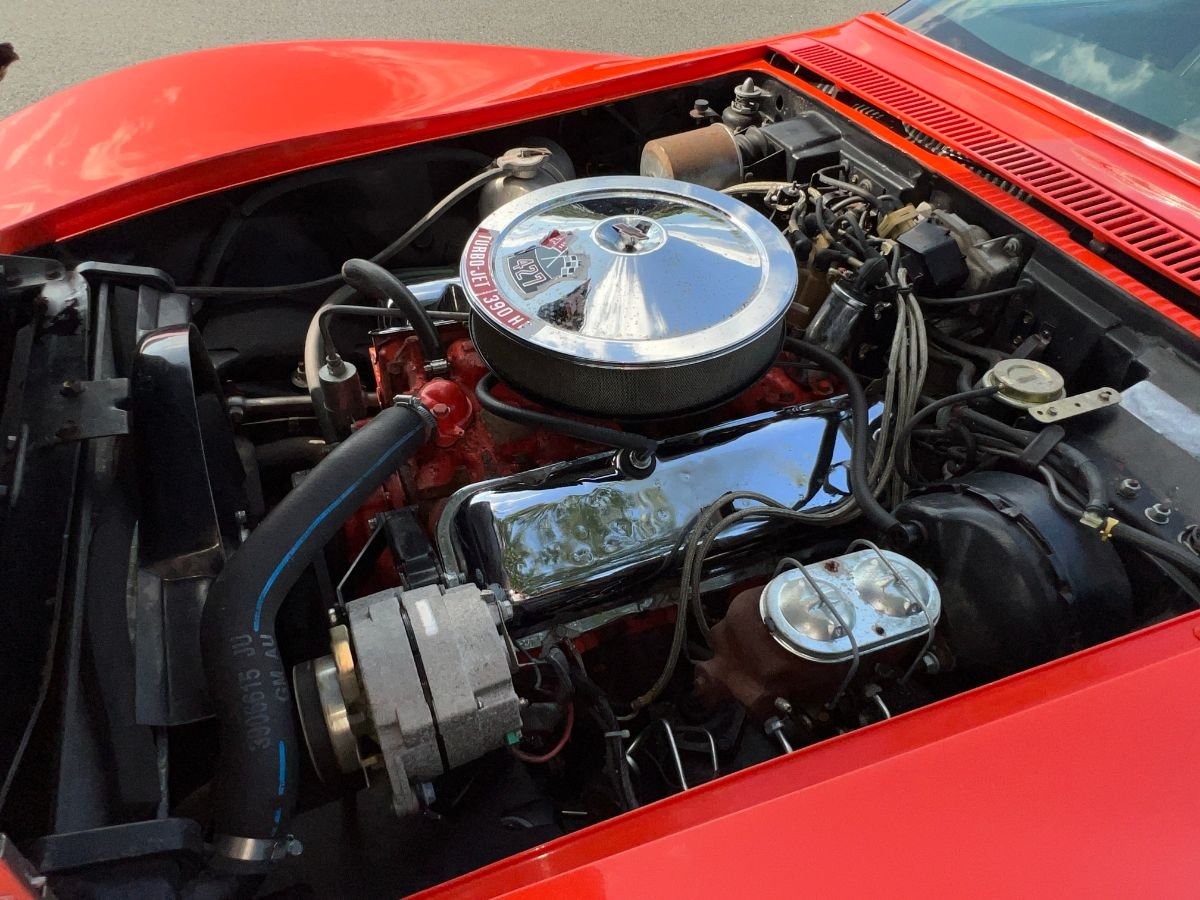 The Monaco Orange (code 990) paint was refinished during the 2015 frame-off restoration under the direction of John’s Corvette Service in Laconia, New Hampshire. Features include rocker moldings, driver-side mirror, rear-mounted antenna, and special domed big-block hood.