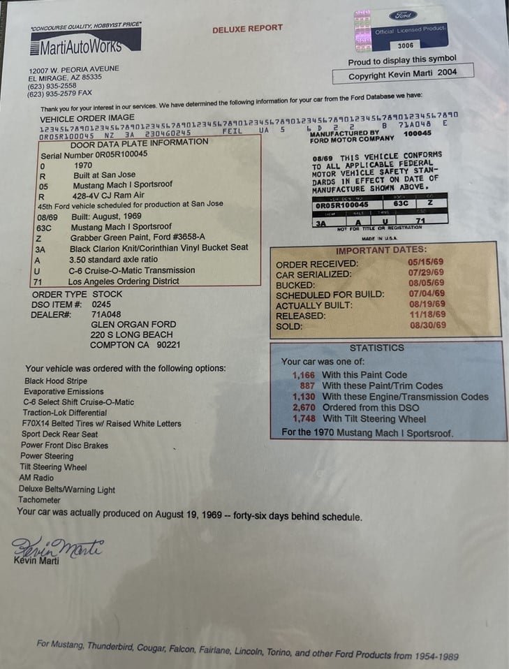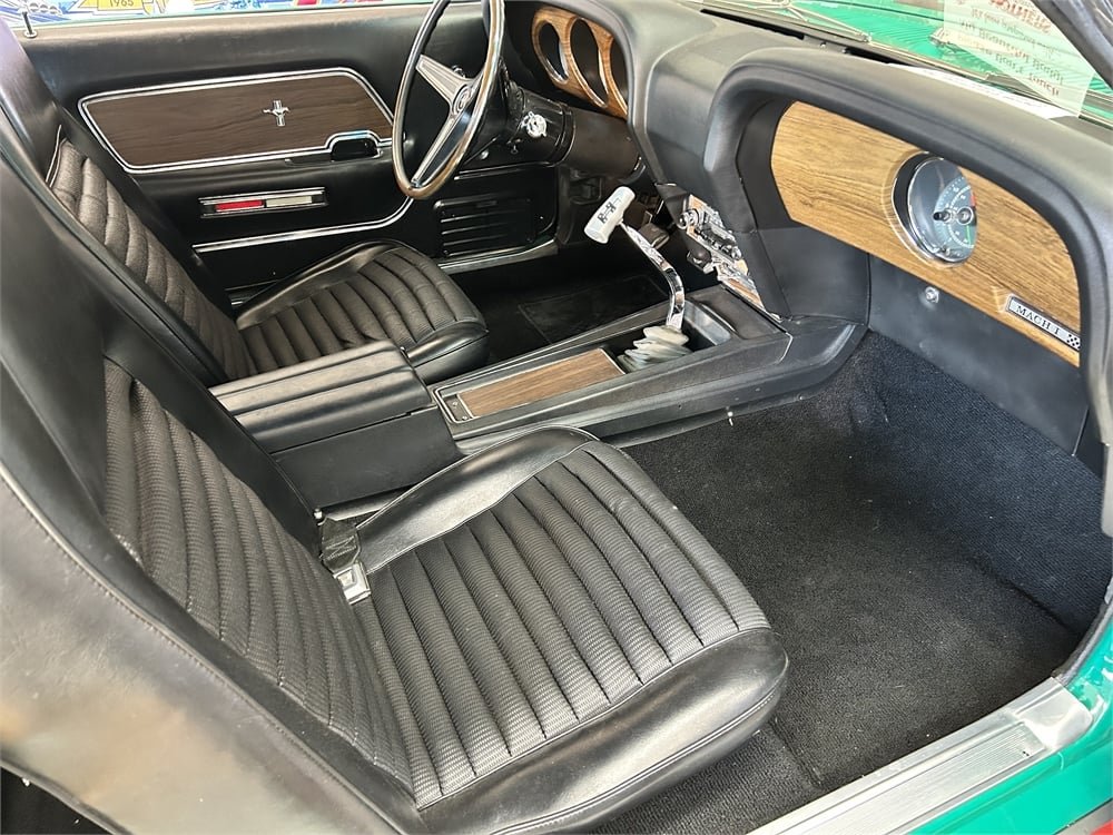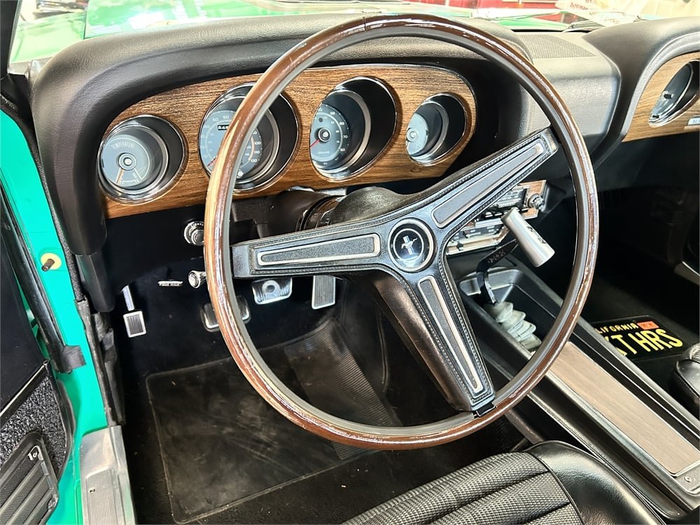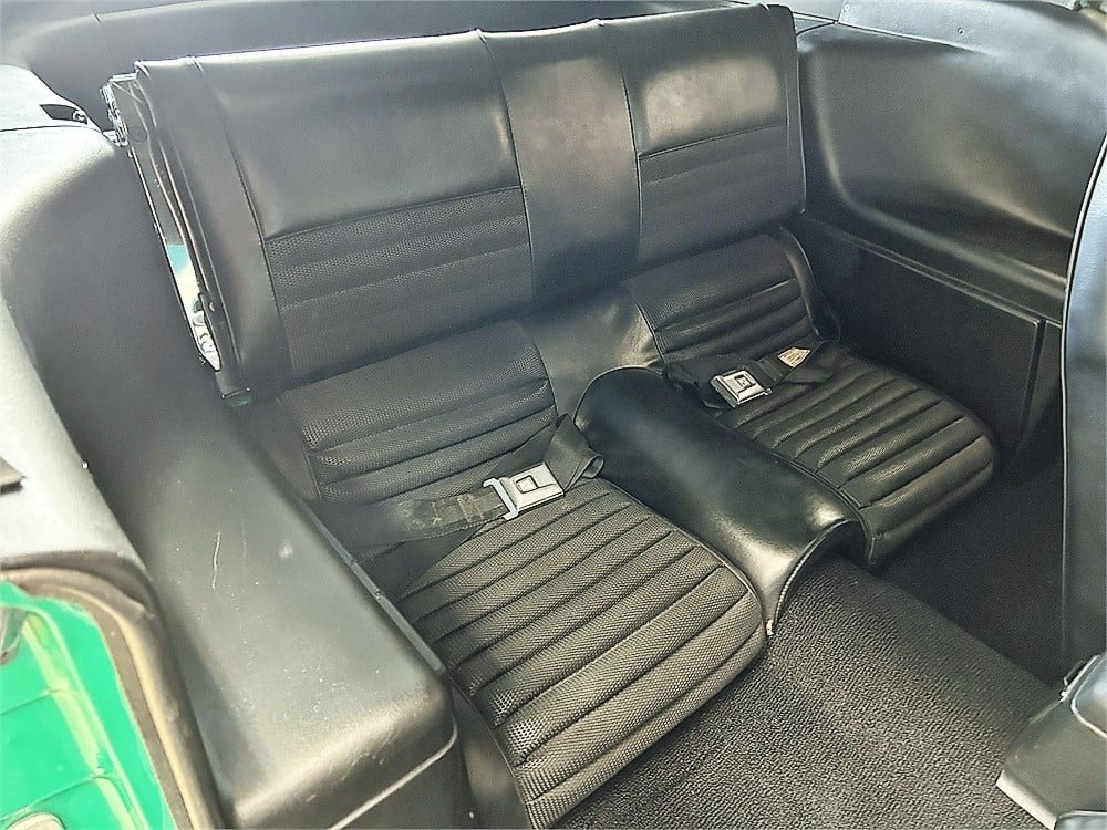 This Mach I SportsRoof (Ford-speak for “fastback”) was originally delivered to Glen Organ Ford in Compton, California. The exterior has received a complete respray in the original Grabber Green hue (code Z) with black stripes. Exterior features include both chin and rear spoilers, hood pins, dual racing mirrors and rear window louvers.