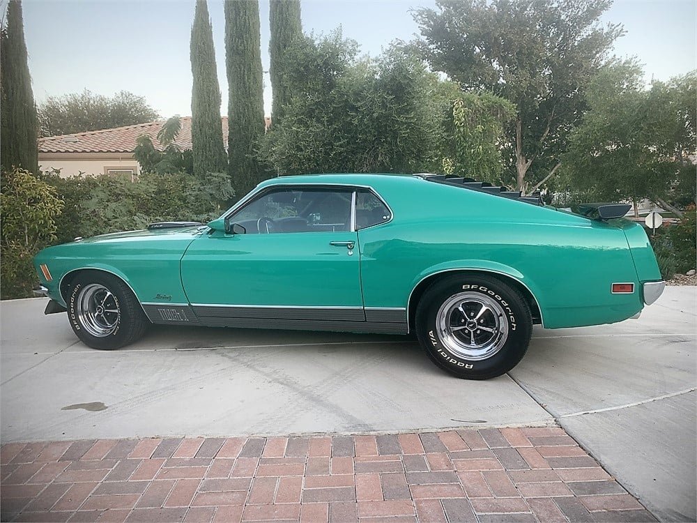 Featured on AutoHunter, the online auction platform driven by ClassicCars.com, is this restored 1970 Ford Mustang Mach I SportsRoof. Power comes from the legendary 428 Cobra Jet V8 with ram air paired with a four-speed manual transmission. Notable equipment includes limited-slip rear, Magnum 500-style wheels, Shaker hood scoop and rev limiter. Finished in Grabber Green over a black vinyl interior, this garage-kept 1970 Mustang Mach 1 comes with Deluxe Marti Report documentation, the original 14-inch wheels with hubcaps and new white-letter bias-ply tires, and a clear title.