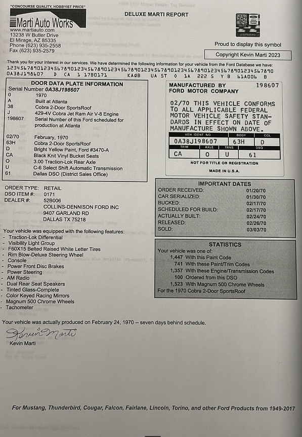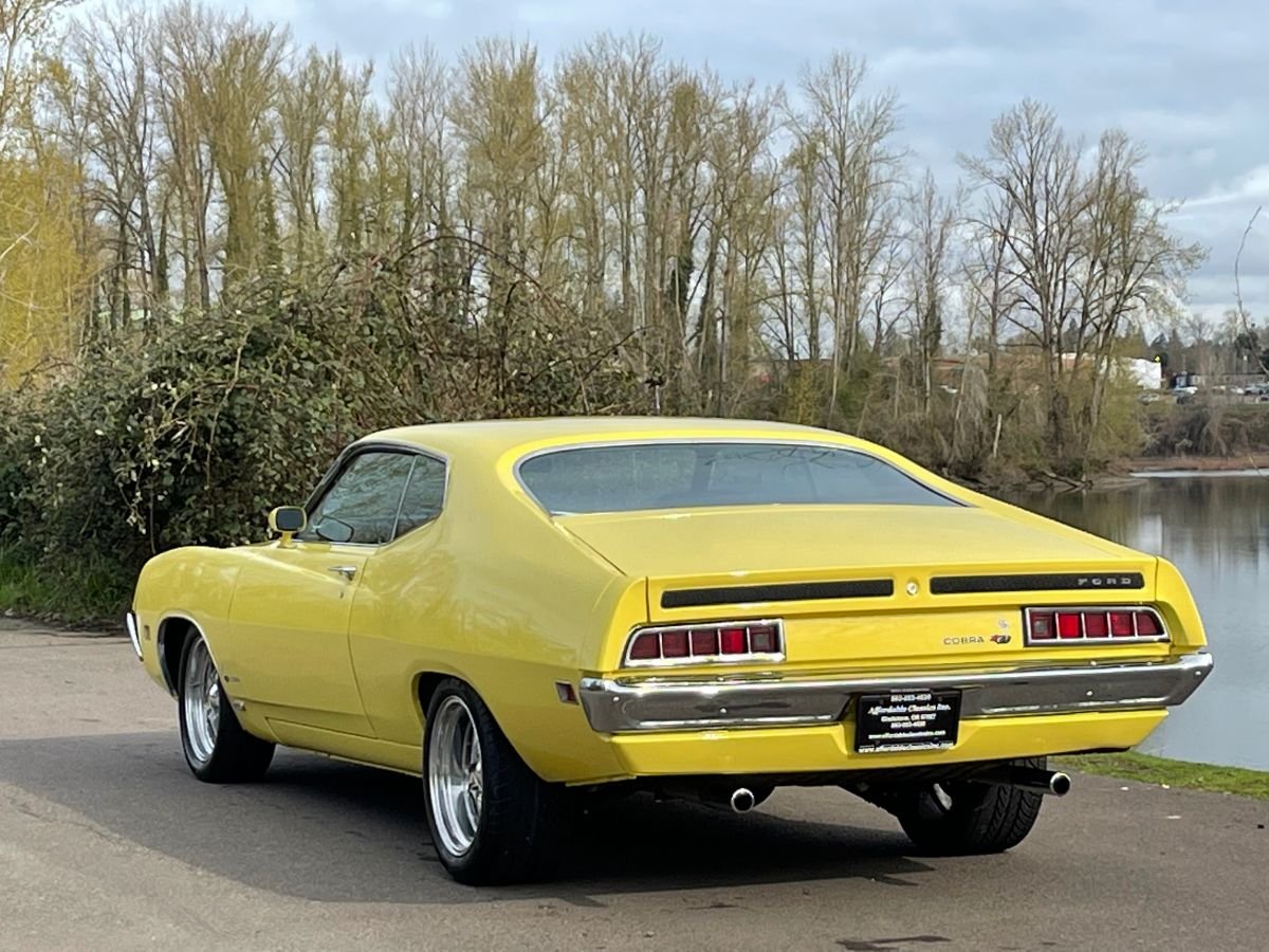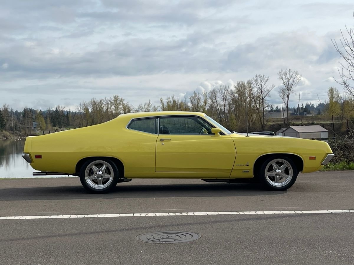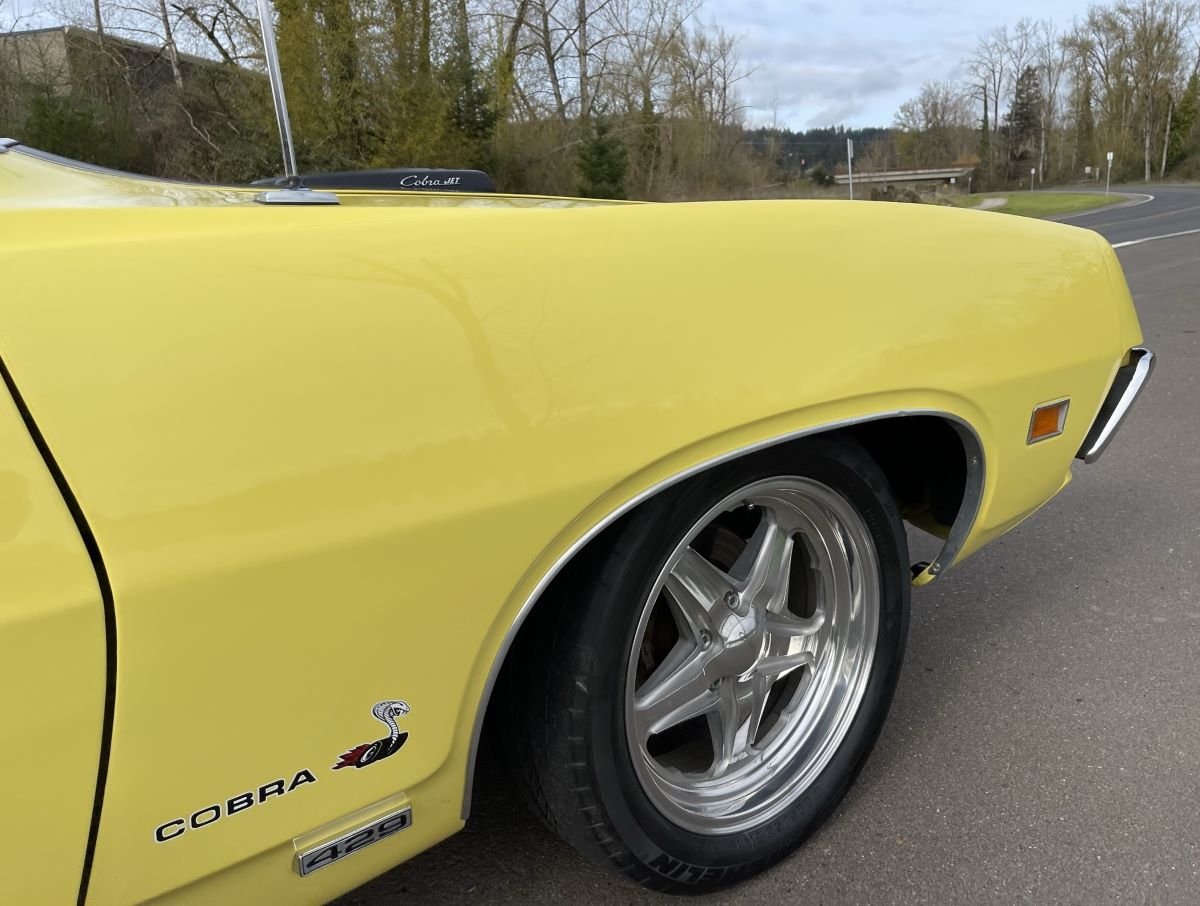 This vehicle is one of 7,675 Torino Cobras produced for 1970, and one of 1,357 built with the J-code/automatic combination. The exterior has been refinished in the original Bright Yellow after a bare metal body restoration. Features include fender-mounted antenna, matte black hood paint with Shaker hood scoop, twist-lock hood pins, dual color-keyed sport mirrors with manual driver-side remote, 429 emblems, bright wheel lip moldings, and black trunk trim. A walk-around video can be seen on the auction page.