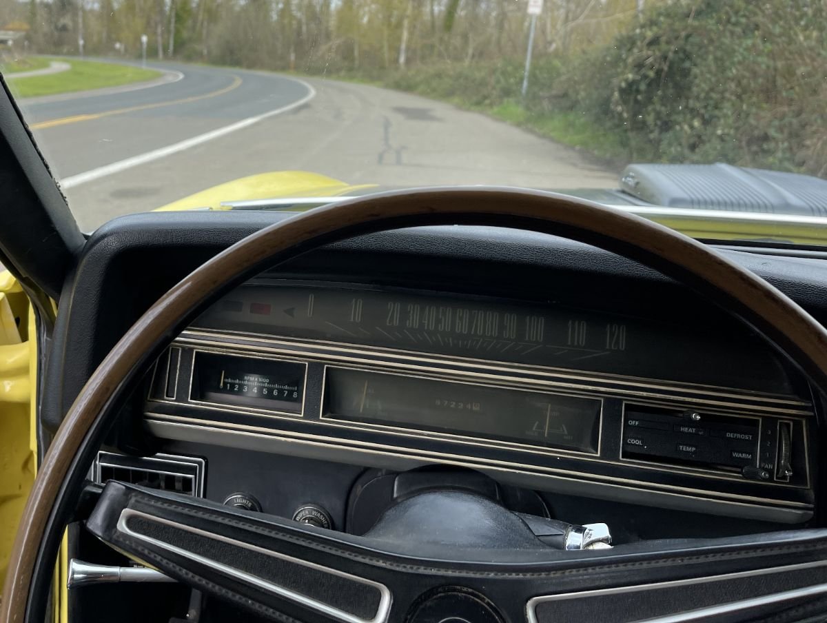 The instrument panel consists of a 120-mph speedometer, 8,000-rpm factory ribbon tachometer, and gauges for the fuel level and temperature. An additional set of three vintage Stuart Warner gauges for the battery voltage, vacuum, and oil pressure are located above the center console. The odometer reads 87,224 miles, which the selling dealer reports to be accurate.