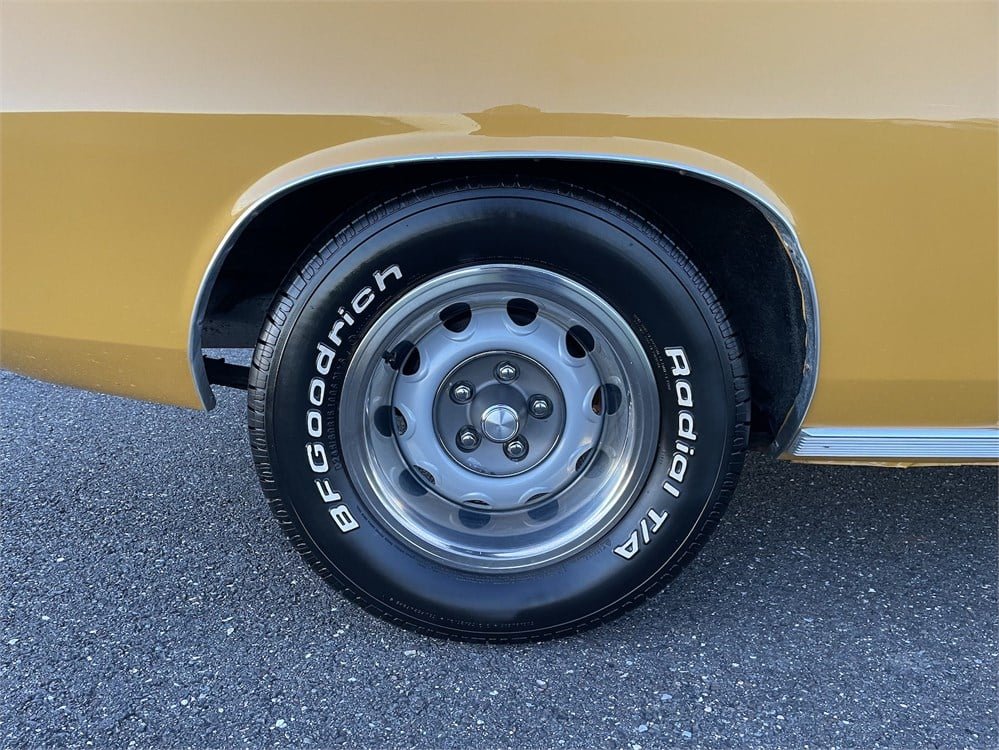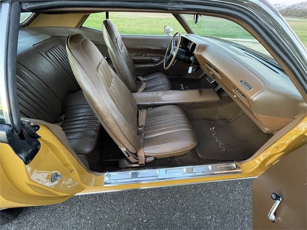 The exterior was stripped to bare metal and refinished in the original color of code EL5 Bahama Yellow during its 2005 restoration. Features include wheel opening moldings, rocker trim, Barracuda Gran Coupe emblems on the doors, and a tobacco brown aftermarket vinyl top. A detailed walk-around video can be seen on the auction page.