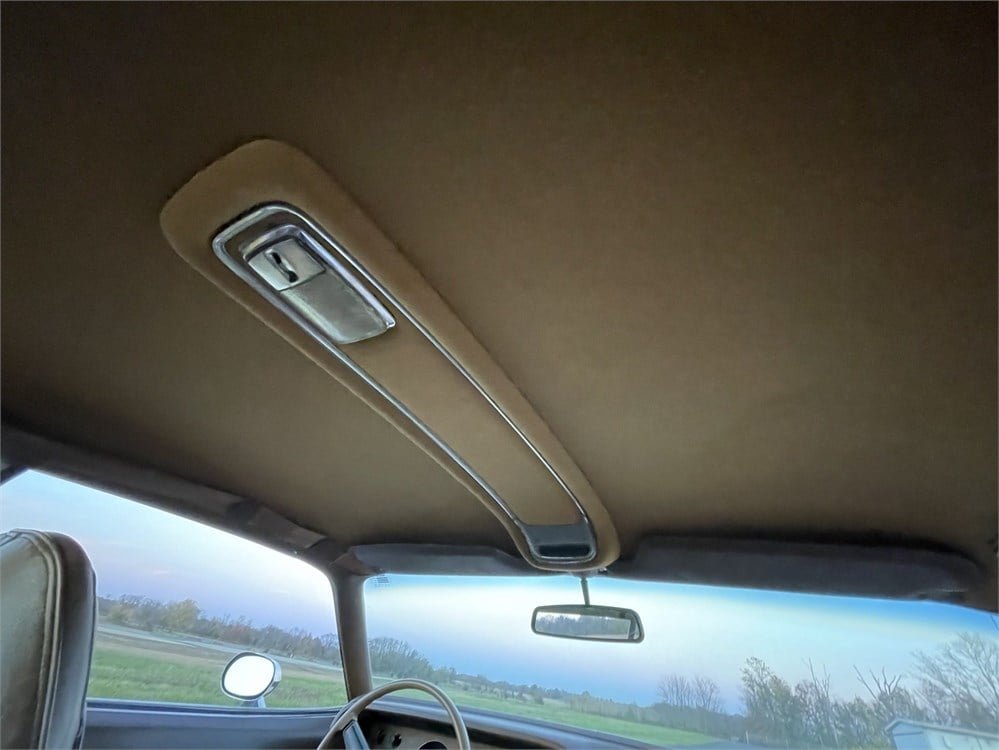 The front buckets and rear seat are upholstered in tan leather. Features include an overhead console, soft molded headliner, optional center console with a locking storage compartment, simulated woodgrain trim, and automatic transmission with Slap-Stik shifter. Additional features include power steering and brakes, AM radio, and air conditioning. According to the selling dealer, the interior is original except for the carpeting, and the dashboard has a few fine cracks.