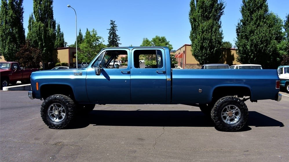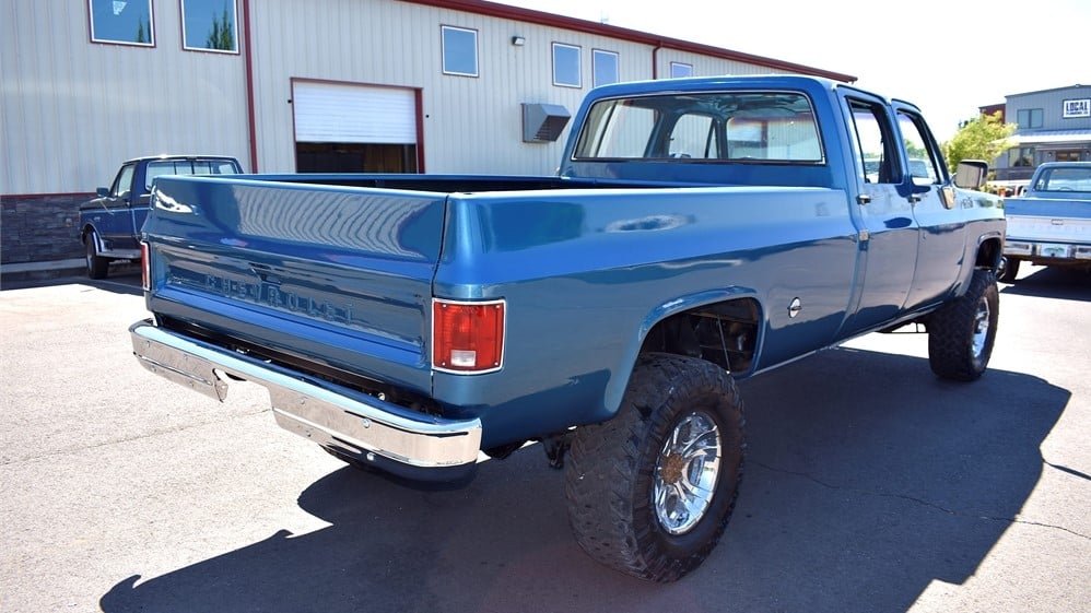 Front bench seats are largely a thing of the past, which means that being able to comfortably accommodate six people inside a traditional car or truck interior is not an easy task. That’s where this vintage square body C/K-Series truck presents a compelling case. Finished in metallic blue and optioned with a four-inch suspension lift, power steering, and newer wheels and tires, this six-passenger, one-ton, crew-cab truck is being sold by a dealer in Oregon with a clear title.