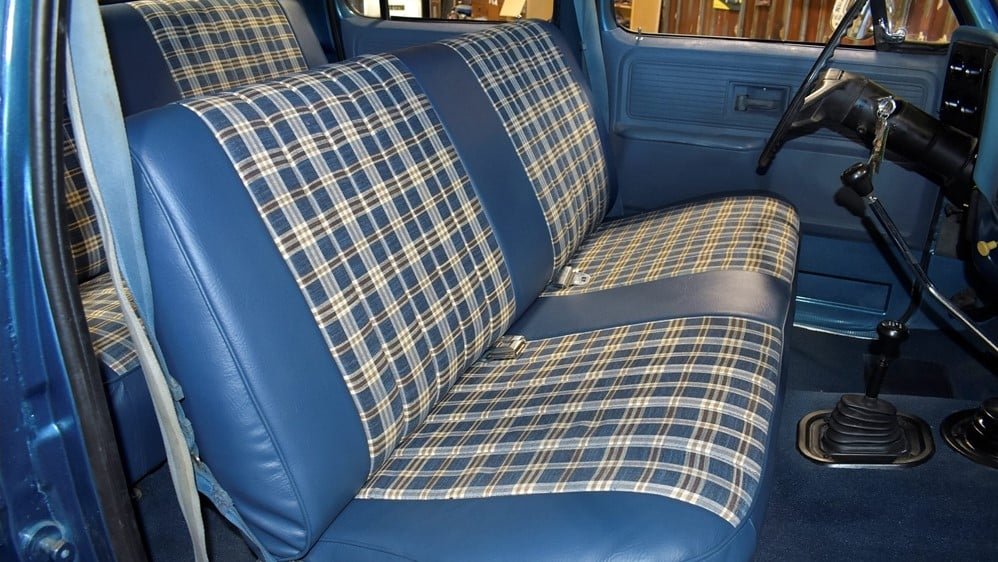 For being over 40 years old, this truck doesn’t look it. The metallic blue exterior was resprayed within the last few months and the overall body appears to be straight. One of the unique features of trucks from this era – from other pickup brands, too – was a dual-fuel-tank setup. Each tank holds 16 gallons, so with a total capacity of 32 gallons, this truck has respectable driving range even with a V8 powerplant. Completing the exterior look is a four-inch suspension lift, a set of polished aluminum wheels, and newer all-terrain tires.