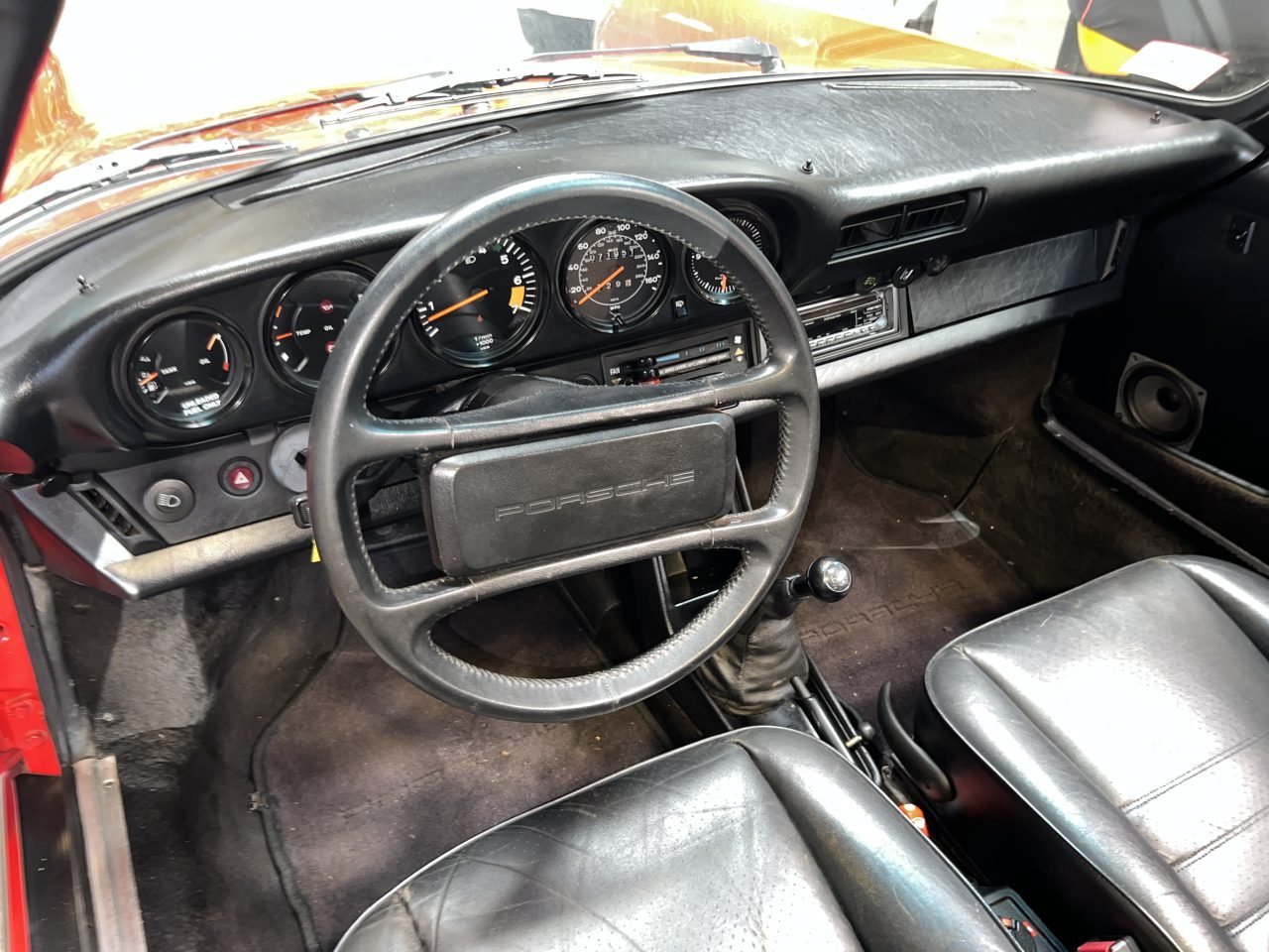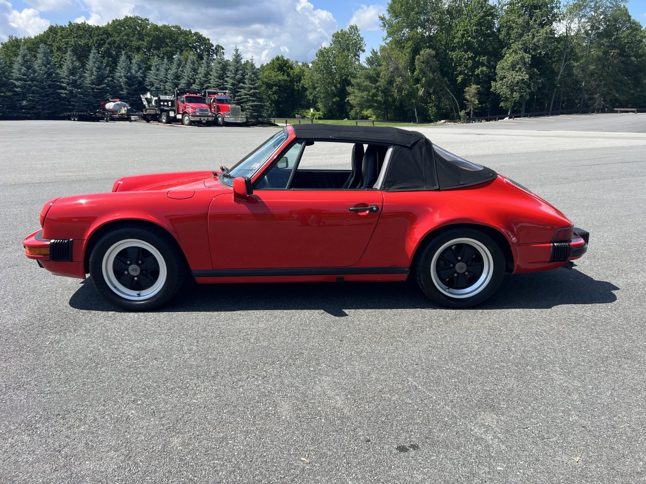 The Exterior of this 911 is described as still having its original, factory-applied Guards Red. Features include color-keyed bumpers, color-matched mirror housings, a manual black cloth convertible top, and black trim. The selling dealer does state that there are a few chips in the paint, something normal for a 38 year old car in original paint.