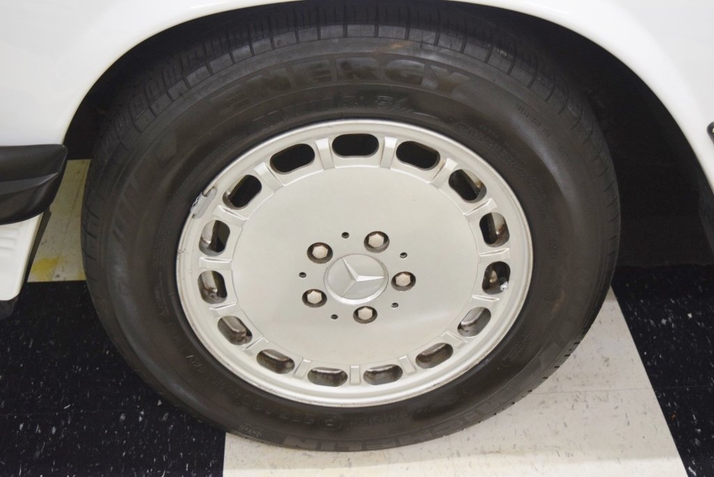 The car rides on a set of its original 15-inch Mercedes Gullideckel alloy wheels that are wrapped in 205/65R15 Michelin radial tires. The selling dealer states the tires should be replaced due to their age.